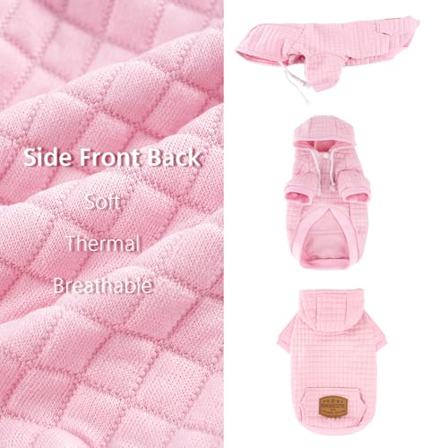EYE-CATCHING ASPECT OF FASHION: This 3D-cut cold weather dog clothes with hood holds its shape, even during active play. Waffle fabric style adds visual and tactile appeal, keeping your pup warm while looking fashionable. The leather label on the hood adds a touch of high-end and light luxury.The dog apparel & accessories enhances recognition, allowing you to spot your beloved pet