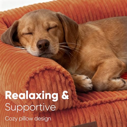 FUKUMARU Dog Couch Bed, Corduroy Cozy Cat Bed for Indoor Cats with Washable Cover, 28in Waterproof Orthopedic Dog Beds Sofa for Small Dogs and Large Cats, Cute Warm Cotton Pet Sofa, Orange