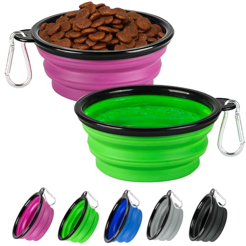 Collapsible Dog Bowl 2 Pack, Dog Water Bowls for Travels, Portable Foldable Pet Bowls Feeding Watering Dish for Parking Walking Camping with 2 Carabiners Clip (12oz, Small, Green+Purple)