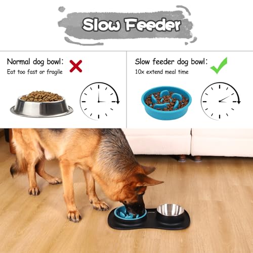 Slow Down Eating Speed: The dog bowls set comes with a slow feeder dog bowl featuring a unique ridge and maze pattern design, which helps slow down the eating speed of dogs that tend to gobble their food. The slow feeder dog bowls aids in better digestion for pets, preventing various dietary issues such as indigestion, bloating, choking, and obesity. The dog bowl allows dogs to enjoy a longer mealtime experience and helps pets develop good eating habits