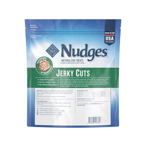 Slowly oven-dried, easy to tear, and packed with protein, these mouthwatering treats are made with real USA chicken. With no artificial flavors or preservatives, BLUE Nudges Jerky Cuts are a healthy treat your dog will be excited to eat, and you can feel great about giving. BLUE Nudges are brought to you by Blue Buffalo, the leader in natural pet food. Love them like family. Treat them like family